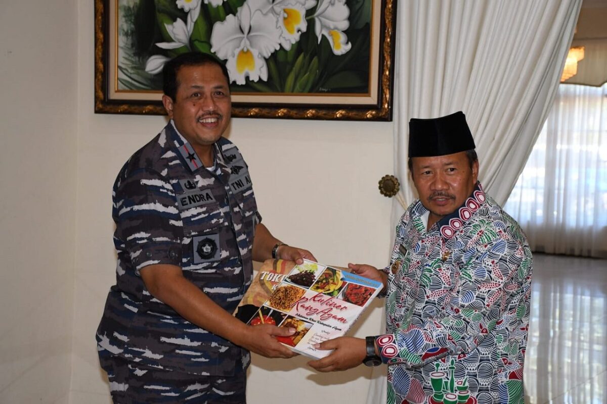 SERAHKAN BUKU—Bupati Agam DR Adnri Warman serahkan buku petunjuk alam Agam kepada Danlantamal II Laksma TNI Endra Sulistiyono.