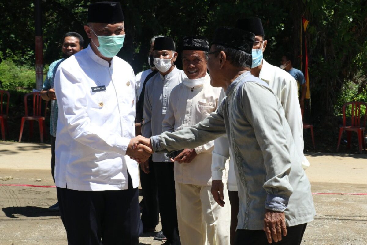 SAMBUT—Gubernur Sumbar Mahyledi saat disambut pantia masjid sebelum meresmikan Masjid Yaqwa Pagai kemarin.