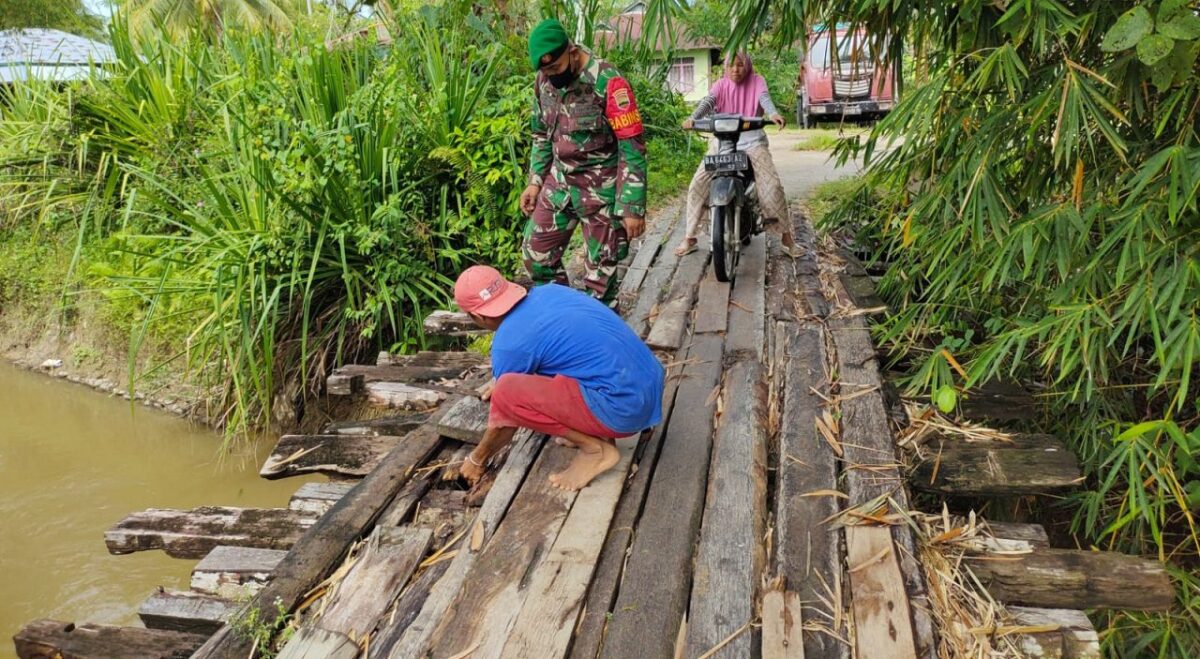 Sertu Joni Iswandi menyampaikan, jembatan yang rusak akibat lapuk ini membuat sebagian besar papan di atasnya rapuh. “Hanya tersisa beberapa helai papan. Jembatan ini sebagai akses utama menuju tiga Korong, yakni Korong Batang Tapakis, Korong Palembayan, dan Korong Tanjung Pisang,” jelasnya.