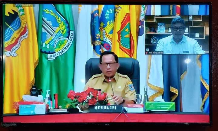 RAPAT KERJA MENDAGRI— Wali kota Solok Zul Elfian mengikuti arahan saat rapat kerja secara virtual dengan Mendagri RI Tito Karnavian, Senin (24/1).