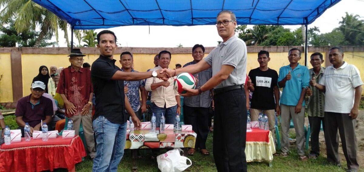 PESSEL, METRO–Wakil Ketua Mantan Atlet Voli Indonesia (MAVI) Sumbar, Aprizal Cai memberikan sambuatan pembukaan Kejuaraan Bola Voli antar nagari se-Pessel yang dilaksanakan Pemuda Kampung Koto Rawang di Koto Rawang, Kecamatan Lengayang, Pesisir Selatan, Sabtu (22/1).