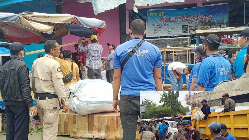 PASARRAYA, METRO–Pedagang Kaki Lima (PKL) yang berjualan di sepanjang jalan Sandang Pangan, Permindo, dan Pasar Raya Barat di kawasan Pasar Raya Padang ditertibkan petugas gabungan dari Dinas Perdagangan (Disdag) dan Satuan Polisi Pamong Praja (Satpol PP) Kota Padang, Rabu (26/1).