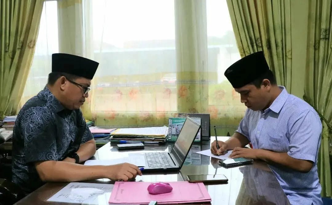 PADANG, METRO–Kepala Kantor Wilayah Kementerian Agama Provinsi Sumatra Barat diwakili Kepala Bagian Tata Usaha, H. Irwan saat menjadi pembicara dalam Program Dialog Sumbar, RRI Pro 1 Padang, Selasa (1/2). Kabag TU yang tampil secara virtual dari ruang kerjanya didampingi Sub Koordinator Subbag Ortala dan KUB, Fauqa Nuri Ichsan.