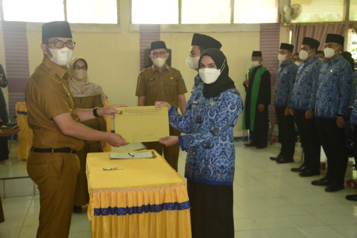 SAWAHLUNTO, METRO–Walikota Sawahlunto Deri Asta bersama Sekretaris Daerah (Sekda) Dr dr Ambun Kadri MKM mengambil sumpah jabatan dan menyerahkan Surat Keputusan (SK) terhadap Pegawai Negeri Sipil (PNS) formasi tahun 2019 di lingkungan Pemko Sawahlunto, Senin (31/1).