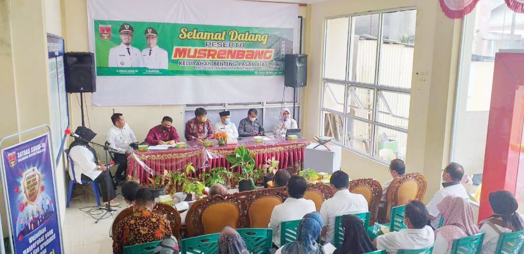 BUKITTINGGI, METRO–Kelurahan Benteng Pasar Atas, gelar musrenbang kelurahan di aula setempat, Rabu (9/2). Pengedaman Tebing Benteng Belakang Hotel Nirwana dan pengadaan WC umum representatif menjadi persoalan krusial yang diinginkan masyarakat.