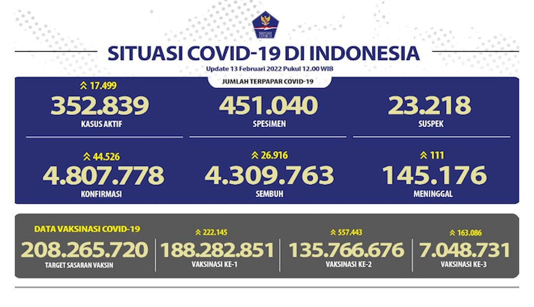 Sementara kasus positif harian, Minggu (13/2) bertambah 44.526 orang. Tes yang dilakukan sangat masif yakni 451 ribu tes spesimen. Kini total sudah 4.807.778 orang terinfeksi Covid-19.