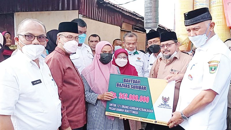 BUKITTINGGI, METRO–Badan Amil Zakat Nasional (Baznas) Sumbar salurkan bantuan kepada 121 pedagang yang terdampak tiga musibah kebakaran Pasar Bawah Bukittinggi. Bantuan itu, diserahkan Gubernur didampingi Ketua Baznas Sumbar, Wakil Walikota Bukittinggi dan Ketua Baznas Bukittinggi di Pasar Bawah, Rabu (16/2).
