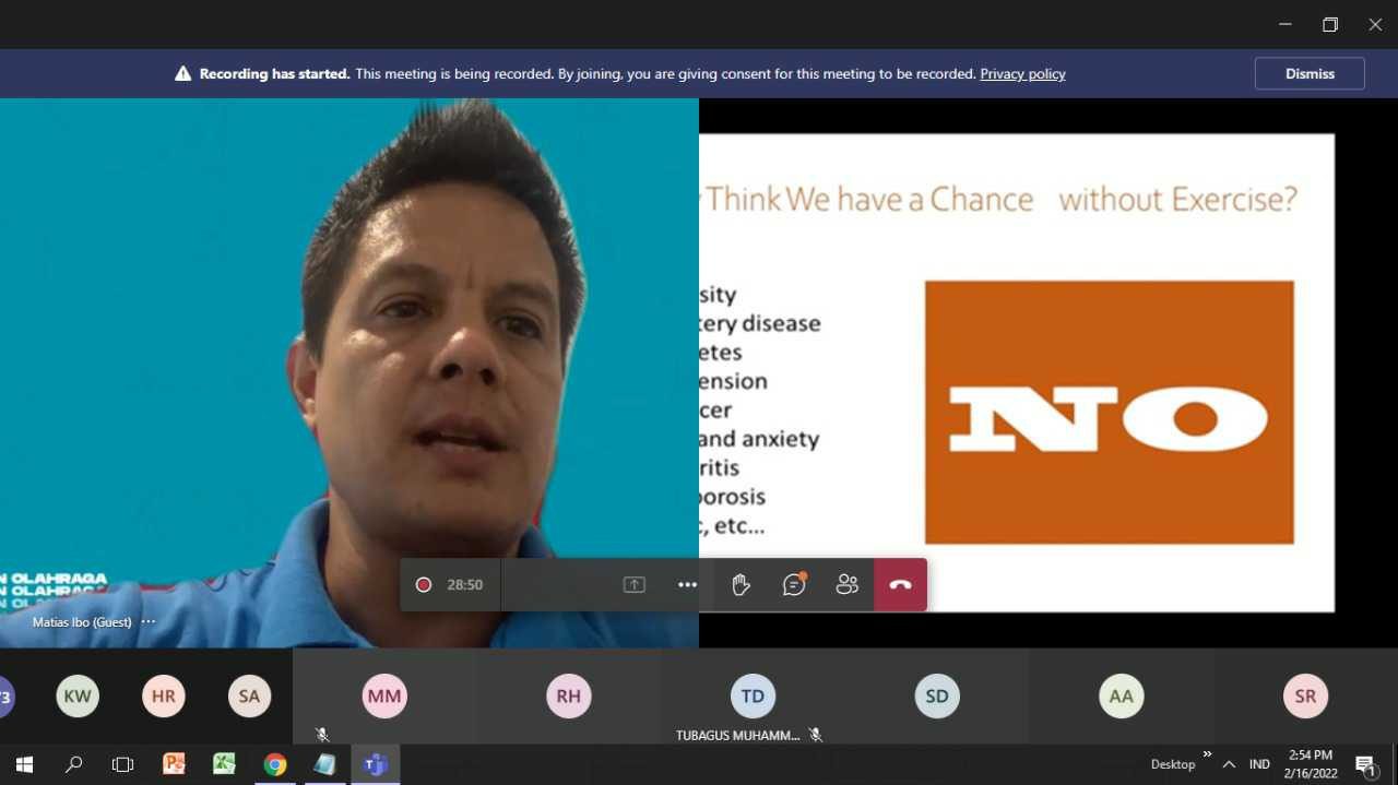 PADANG, METRO–Dalam menyambut HUT ke-112 tahun, PT Semen Padang (PT SP) menggelar webinar tentang olahraga dengan tajuk “Bahagia de­ngan Olahraga” dengan menghadirkan fisioterapis Indonesia, Matias Ibo, Rabu (16/2). Direktur Keuangan PT Semen Padang Tubagus Muhamamd Dharury ketika membuka webinar menekankan, bahwa olahraga merupakan kunci agar kita sehat. “Kalau tidak olahraga, badan akan sakit. Saya sendiri pernah merasakan badan sakit karena 1,5 bulan tidak berolahraga,” kata Tubagus.