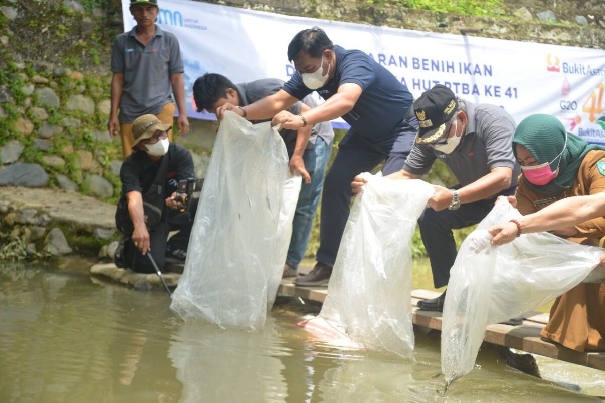TEBAR BIBIT IKAN— PT Bukit Asam (PTBA) tebarkan bantuan bibit ikan lebih kurang sebanyak 45 ribu ekor bagi masyarakat Sawahlunto.