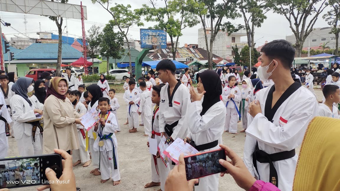 BUKITTINGGI–Ketua Umum Pengkot Taekwondo Indonesia (TI) Bukittinggi Hj Noni, mengalungkan langsung mendali yang diraih atlet Taekwondo Dojang Kodim 0304 Agam saat berlaga di Pekanbaru, Riau dalam memperebutkan Piala Wali Kota Pekanbaru 2022.