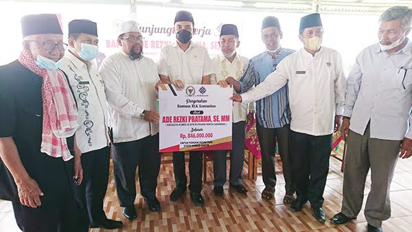 BANTU— Anggota DPR RI Komisi IX, Ade Rezki Pratama, menyerahkan bantuan untuk pembangunan Balai Latihan Kerja (BLK) Pondok Pesentren Syech Ahmad Khatib Al Minangkabawi Koto Tuo, Balai Gurah,1 Ampek Angkek.
