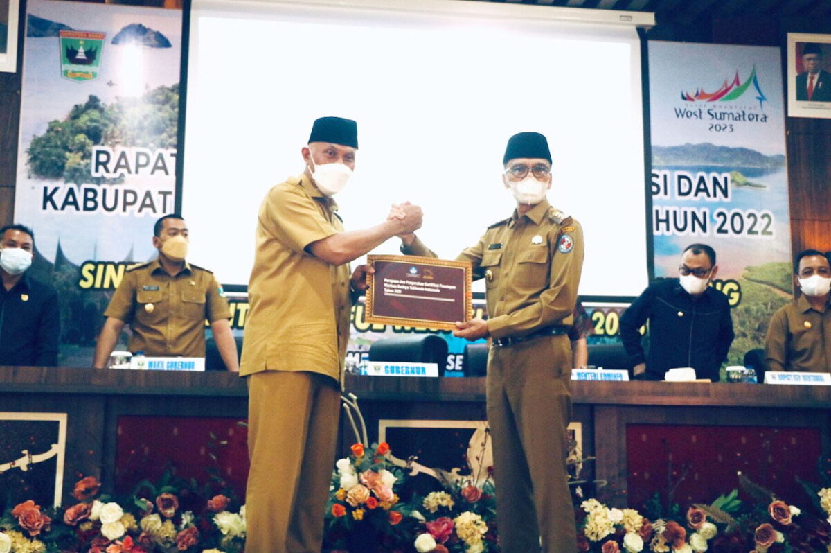 LIMAPULUH KOTA, METRO–Bupati Lima Puluh Kota, Safaruddin Dt.Bandaro Rajo, menerima sertifikat warisan Budaya Tak Benda, Tenunan Kubang, Kabupaten Lima Puluh Kota dari Kementerian Pendidikan Kebudayaan Riset dan Teknologi yang diserahkan Gubernur Sumbar, Mahyeldi.