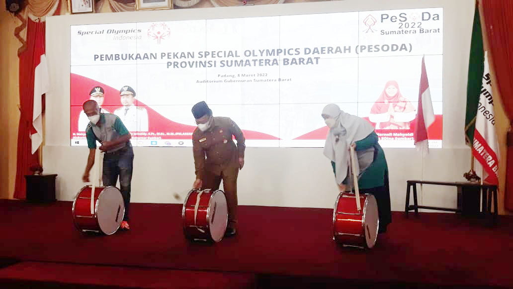 PADANG, METRO–Pekan Special Olympics Daerah (Pesoda) Provinsi Sumatera Barat (Sumbar) resmi ditabuh Sekretaris Daerah (Sekdaprov) Hansastri bersama Ketua SOIna Sumbar Harneli, di Aula Gubernuran Sumbar, Selasa (8/3).