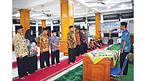 BELIMBING, METRO–Lurah Kuranji Kasman Efendi melantik Ketua RW XI Usman Gumanti dan Ketua RT 1 hingga RT 8 di lingkungan RW XI jalan jeruk blok G Kelurahan Kuranji, Kecamatan Kuranji di Masjid An Nur Kompleks Belimbing, Sabtu (12/3) malam.