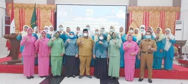FOTO BERSAMA—Bupati Padangapriaman Suhatri Bur bersama Ketua TP PKK Padangpariaman Ny Yusrita Suhatri Bur foto bersama anggota.