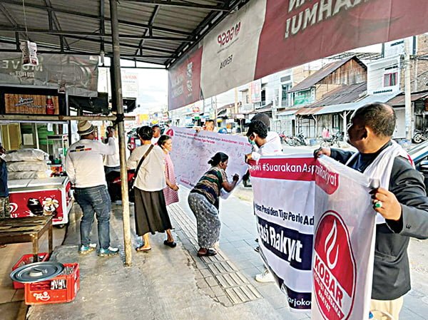 TOBA, METRO–Masyarakat Toba yang mengatasnamakan Koalisi Bersama Rakyat (KOBAR) memberikan dukungan kepada Presiden Joko Widodo (Jokowi) untuk kembali maju menjadi capres di tahun 2024. Adapun aksi dukungan yang dilakukan KOBAR, mereka menyambangi masyarakat Balige yang ada di pusat kota, baik kepada para pedagang pasar, pengusaha, sopir, tukang becak dan elemen masyarakat lainnya dengan berjalan kaki, sembari membawa spanduk, Sabtu (19/3). Tampak spanduk yang bertuliskan “2024 Setia bersama Jokowi” dan “Bukan Jokowi, Keinginan Presiden Tiga Periode Adalah Aspirasi Rakyat”.