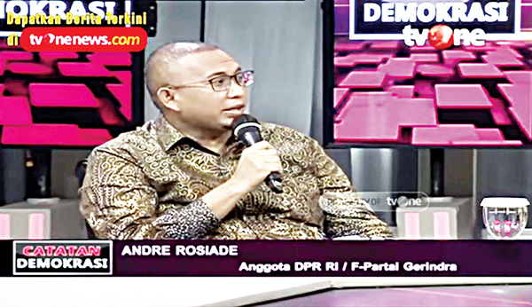 ADINEGORO, METRO–Anggota DPR RI dari Fraksi Partai Gerindra Andre Rosiade tampil dalam acara “Catatan Demokrasi” TV One, Selasa (5/4) malam. Andre hadir bersama ekonom senior Faisal Basri, Staf Khusus Menteri BUMN Arya Sinulingga dan pakar kebijakan publik Achmad Nur Hidayat. Pada acara yang disebut-sebut sebagai pengganti Indonesia Lawyer Club (ILC) itu, Andre membeberkan kinerjanya sebagai anggota DPR, baik pribadi, komisi ataupun secara umum.