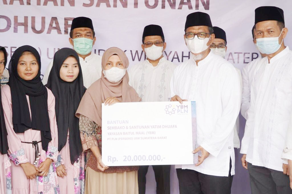 Penyaluran paket sembako diserahkan secara simbolis oleh Ketua YBM Sumbar Afriman kepada pengurus panti asuhan Afrida Hasan dan disaksikan oleh Executive Vice Presiden (EVP) Distribusi PLN Regional Sumatera Kalimatan (Regsumkal) Jefri Rosiadi bersama dengan GM PLN UIW Sumbar Toni Wahyu Wibowo.