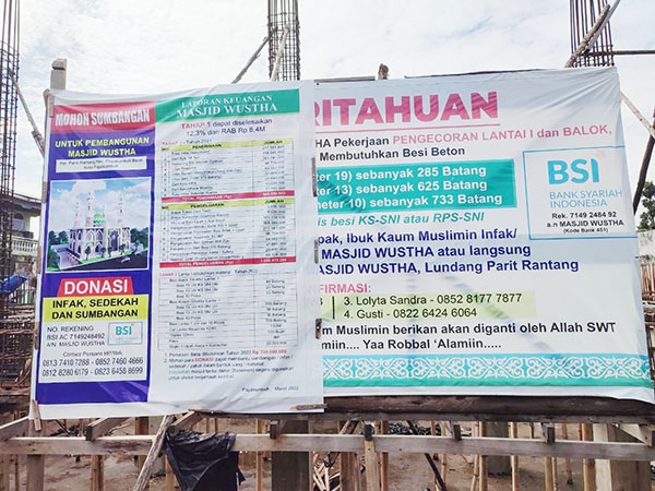 “Dimana untuk lantai pertama digunakan untuk basement, lantai kedua untuk mesjid dan lantai ketiga untuk TPA. Dan untuk bantuan kali ini yang akan digunakan pembangunan lantai kedua masjid kita membutuhkan anggaran sekitar Rp340.000.000 lagi karna pihak panitia pembangunan sudah menerima bantuan sebanyak Rp200.000.000 sebelumnya dari bantuan masyara­kat, agar mesjid kita ini dapat segera digunakan lantai pertama untuk melaksa­nakan sholat,” bebernya.