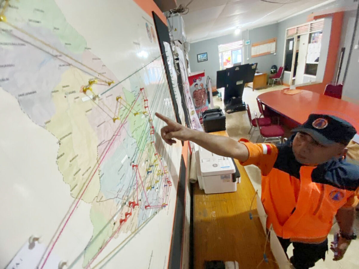 TUNJUKKAN PETA— Plt Kalaksa BPBD Limapuluh Kota Rahmadinol, menunjukkan peta wilayah yang rawan terjadi bemcana longsor dan banjir di Limapuluh Kota.