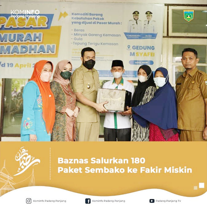 Badan Amil Zakat Nasional (Baznas) Kota Padang Panjang salurkan sembako sebanyak 180 paket untuk fakir dan miskin yang ada di Kota Padang Panjang.