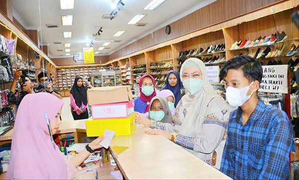 BELI SEPATU—Sebelum diajak menginap di Rumah Dinas Wako, keluarga ibu Mainizar (51), diajak belanja sepatu dan juga jalan-jalan ke Pantai Padang oleh Wako Hendri Septa dan istri, Ny. Genny Putrinda.