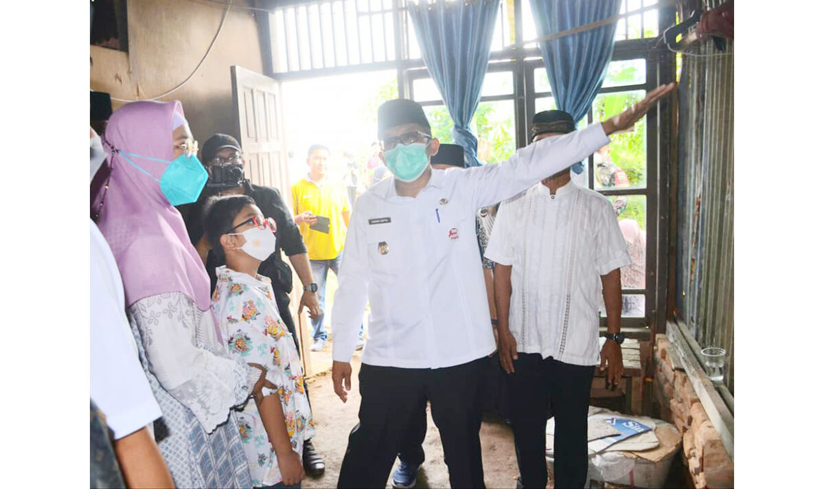RUMAH DIREHAB—Wali Kota Hendri Septa didampingi Ketua TP-PKK Ny. Genny Putrinda melihat kondisi rumah Ibu Maini dan keluarga, Selasa (19/4), di Jalan Belanti Barat 7 RT 06/RW04, Kelurahan Lolong Belanti, Kecamatan Padang Utara.