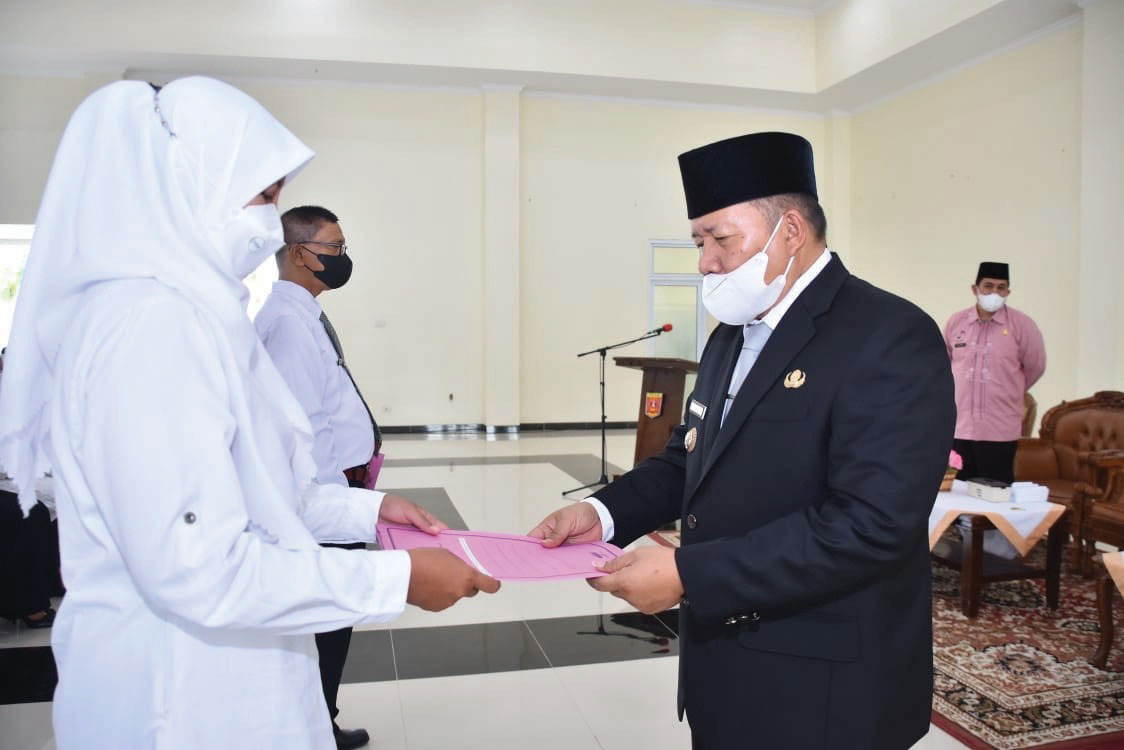 AGAM, METRTO–Bupati Agam Andri Warmanserahkan secara simbolis Surat Keputusan (SK) Bupati Agam, tentang pengangkatan Calon Pegawai Negeri Sipil (CPNS), di lingkungan Pemkab Agam di Balairung Rumah Dinas Bupati Agam, Padang Baru, Lubuk Basung, Kamis (21/4). CPNS yang menerima SK Bupati Agam pada tahun 2021 sebanyak 242 orang, yang terdiri dari 176 orang tenaga kesehatan dan 66 orang tenaga teknis.