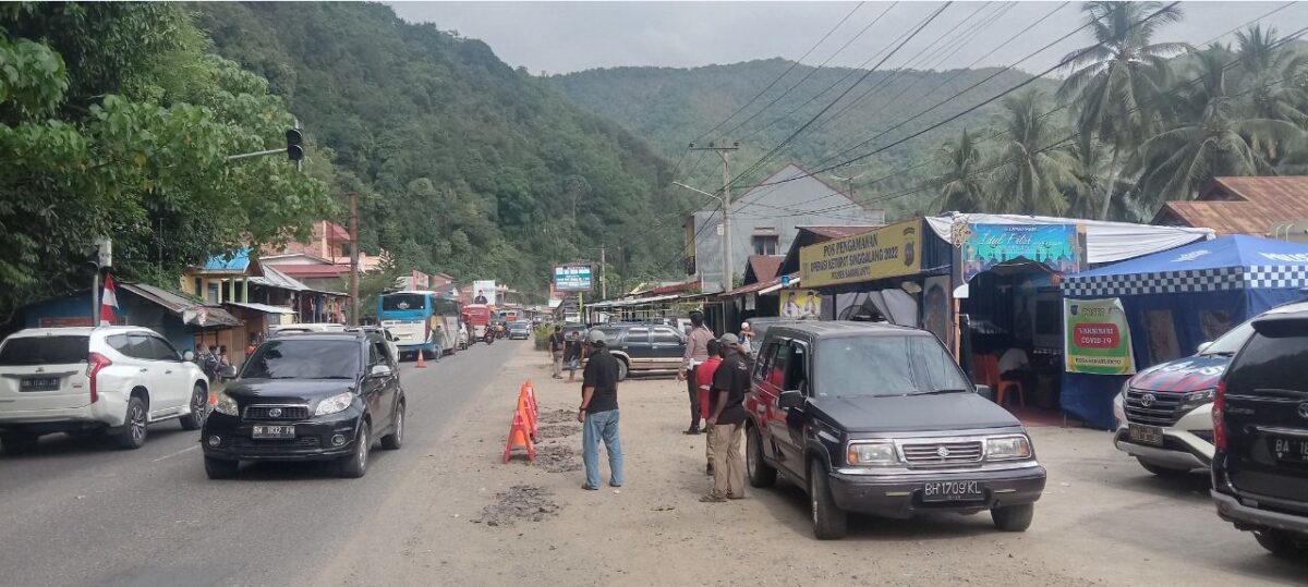SAWAHLUNTO, METRO–Kondisi perbatasan Sawahlunto dengan Ka­bupaten Sijunjung di jalan lintas Sumatera (Ja­linsum) akses menuju Jakarta jelang akhir libur lebaran terlihat ramai lancar dan terkendali, Minggu (8/5).