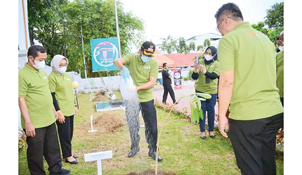 VETERAN, METRO–Wali Kota Padang Hendri Septa memberikan apresiasi dan menyam­but baik BNI Cabang Padang yang melakukan gerakan penanaman pohon mendukung pelestarian ling­kungan di Kota Padang.