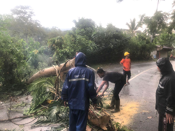 “Pada saat evakuasi pohon yang tumbang instalasi listrik harus dimatikan dulu, sebab kabel listrik tersebut mnyentuh pohon yang tumbang. Maka jelang magrib listrik dipadamkan dulu dan dilakukan pemotongan pohon yang tumbang, sehingga mobil truk yang terhambat lewat dapat segera melalui jalan tersebut,” ujar Donny.
