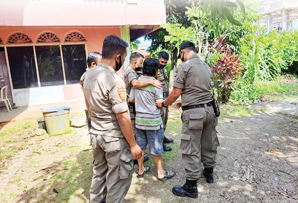 TAN MALAKA METRO–Orang dengan gangguan jiwa (ODGJ) diamankan petugas Satpol PP Kota Padang, Kamis (19/5), di kawasan Kecamatan Kototangah. Aksi orang gila tersebut sudah lama meresahkan dan membuat warga cemas.