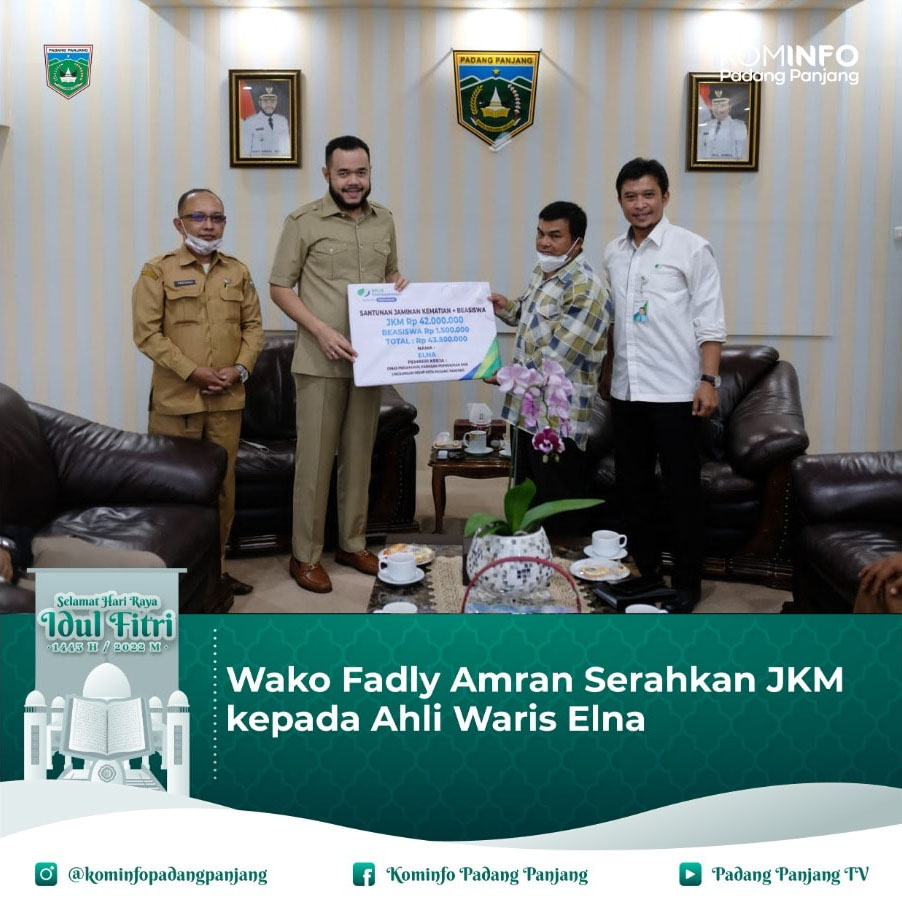 Saat penyerahan JKM di ruang kerjanya itu, Wako Fadly turut didampingi Kepala Dinas Penanaman Modal dan Pelayanan Terpadu Satu Pintu (DPMPTSP) Ewa Soska, S.H beserta Kabid Penanaman Modal dan Ketenagakerjaan, Mardi Suntami, S.E, serta Kepala BPJS Ketenagakerjaan Bukittinggi, Sunjana Achmad.