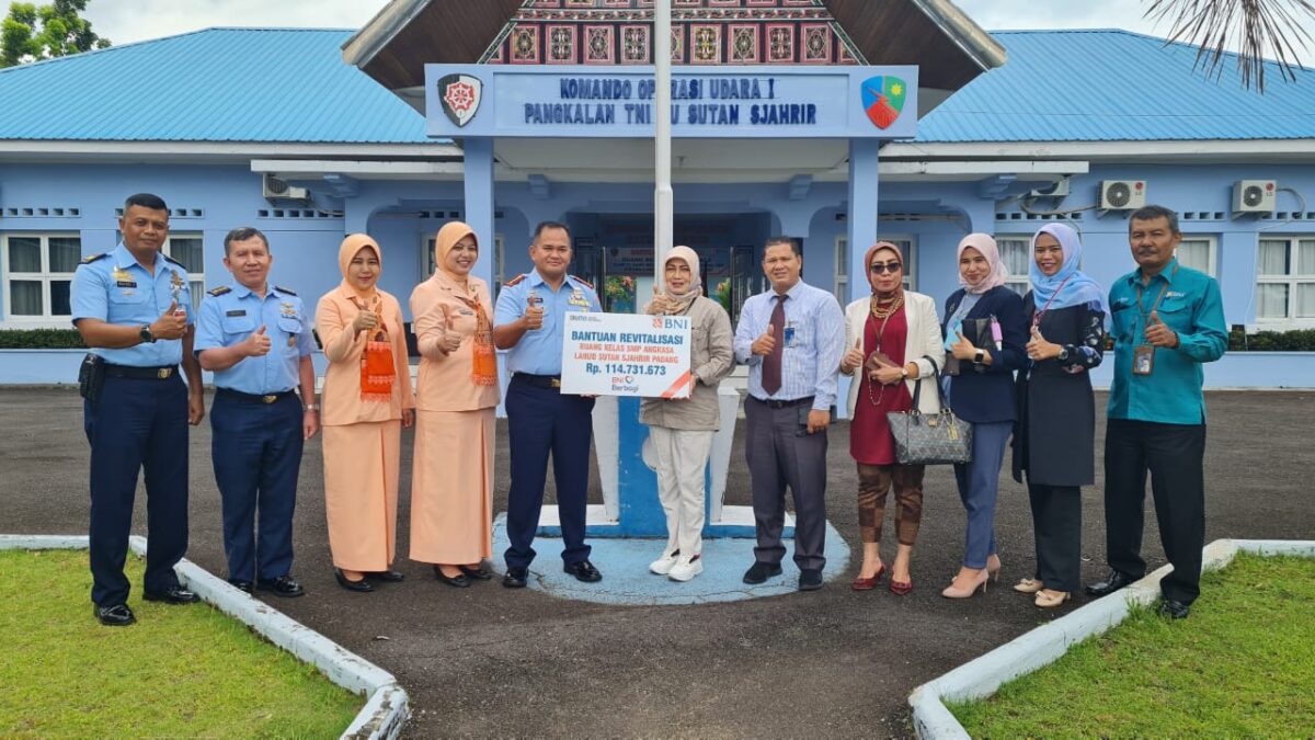 PADANG, METRO–Komandan Lanud Sutan Sjahrir Kolonel Pnb M.R.Y Fahlefie S.Sos., psc, beserta Ketua Yasarini Cabang Lanud Sut Ny. Fifi M.R.Y Fahlefie menerima bantuan renovasi bangunan untuk SMP Angkasa Lanud Sut, dari Bank Negara Indonesia (BNI) Cabang Padang, bertempat di Lobi Mako Lanud Sut Padang, Rabu (25/5).Bantuan Revitalisasi ruang kelas SMP Angkasa ini di serahkan langsung oleh pimpinan Cabang PT. Bank Negara Indonesia (Persero) Cabang Padang Mechy Handayani dengan acara penandatanganan berita acara selanjutnya di terima langsung oleh Komandan Lanud Sut Kolonel Pnb M.R.Y Fahlefie, S.Sos.,psc,.
