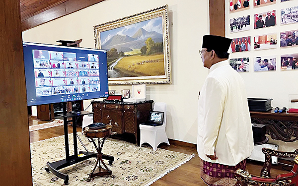 JAKARTA, METRO–Menteri Pertahanan (Menhan) RI Prabowo Subianto mengenakan Beskap Betawi ketika mengikuti Upacara Peringatan Hari Lahir Pancasila 2022 secara daring, Rabu (1/6). Tampak Prabowo mengikuti upacara di sebuah ruangan yang ada karpet berkelir krem. Selain itu, ada pula sebuah layar diletakkan di depan Ketum Gerindra itu.
