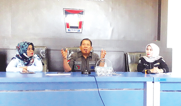 KETERANGAN PERS— Kadis Tenaga Kerja dan Perindustrian Dian Fakri memberi keterangan pers terkait pembangunan sentra rendang yang sudah rampung namun belum bisa digunakan.