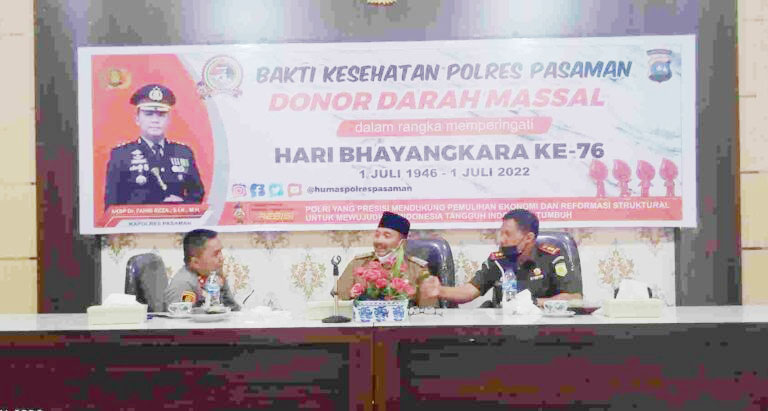 Polres Pasaman menggelar bakti kesehatan donor darah dalam rangka memperingati Hari Ulang Tahun (HUT) Bhayangkara ke 76 tahun 2022 yang jatuh pada  1 Juli kemarin.