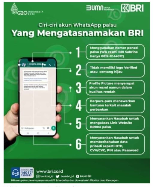 Maraknya aksi kejahatan ini, mendorong BRI untuk terus mengajak nasabahnya dan semua pihak selalu mengedepankan kewaspadaan dalam menerima pesan dalam bentuk apapun dengan tidak terburu-buru percaya dengan ajakan pesan tersebut.