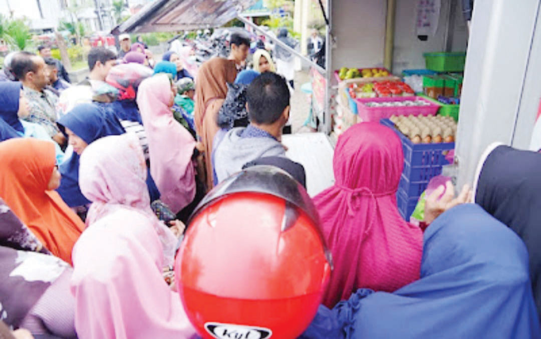“Pada bazar murah sembako yang kita adakan di dua lokasi ini, bawang merah besar kita jual dengan harga Rp 17.000.-/ kg. Harga cabe ¼ kg Rp 23.000.-. Harga bawang kecil ½ kg Rp 20.000,-. Selain itu, juga ada minyak goreng, telur dan gula yang dijual lebih murah dari pasaran,” jelasnya.