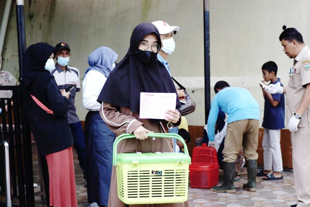 PDG.PANJANG, METRO–Warga Kelurahan Pasar Usang (Paus), Kecamatan Padang Panjang Barat (PPB) antusias bawa hewan peliharaannya untuk divaksin rabies di pelataran Masjid Zu’ama, Jembatan Besi (Jembes), Selasa (21/6).