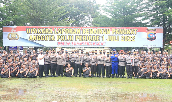 PADANG, METRO–Ratusan personel Polda Sumbar beserta jajarannya mendapatkan kenaikan pangkat setingkat lebih tinggi dari sebelumnya untuk periode 1 Juli 2022. Upacara kenaikan pangkat itu diselenggarakan di Polda Sumbar dan seluruh Polres se-Sumbar, Kami (30/6).