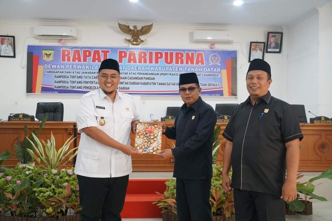 Wabup Richi Aprian menyampaikan jawaban bupati atas pertanyaan atau tanggapan delapan fraksi DPRD terkait tiga Tiga Ranperda yang diajukan adalah Ranperda tentang Pengelolaan Keuangan Daerah, Ranperda tentang Cadangan Pangan dan Ranperda tentang Penyertaan Modal Pemerintah Kabupaten Tanah Datar kepada Perusahaan Umum Daerah Tuah Sepakat.
