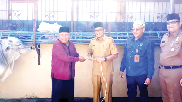 KAMPUNG OLO, METRO–Perumda Air Minum Kota Padang menyerahkan tiga ekor sapi kurban untuk masyarakat Kampung Olo, Kecamatan Nanggalo, Senin (4/7). Penyerahan ini dilakukan oleh Wali Kota Padang Hendri Septa di Masjid An Nur Hikmah.