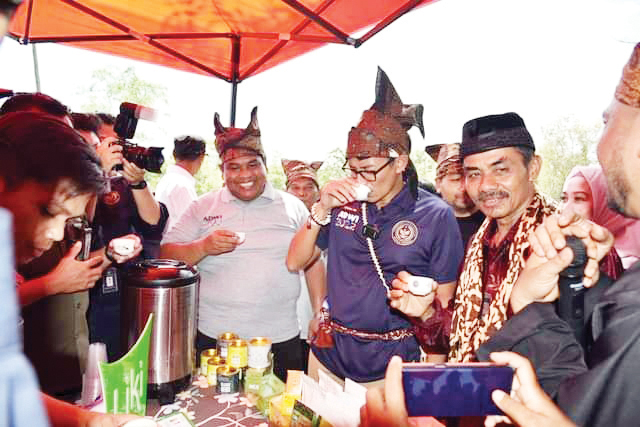 NIKMATI— Bupati Padangapriaman Suhatri Bur bersama Menteri Sandiaga Uno saat menikmati minuman khas GTP.