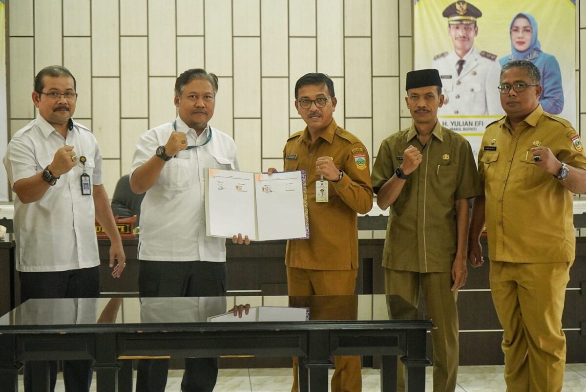 PENANDATANGAN— Foto bersama usai penandatangan BAST Aset, yang dilakukan penandatangan bersama oleh Kusworo Darpito, ST, MM, selaku Kepala Balai Prasarana Pemukiman Wilayah Sumatera Barat dengan Bupati Solok Selatan H Khairunas, di Aula Sarantau Sasurambi, Selasa (5/7).