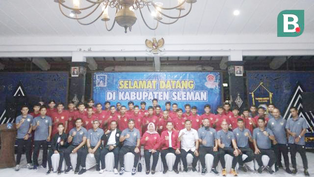 FOTO BERSAMA— Skuad Timnas U-16 beserta pelatih foto bersama dengan Bupati Sleman, Kustini serta para stakeholder sepakbola DIY di rumah Dinas Bupati Sleman sekaligus pelepasan tim untuk turnamen piala AFF U-16 yang akan dimulai 30 Juli mendatang di DIY.