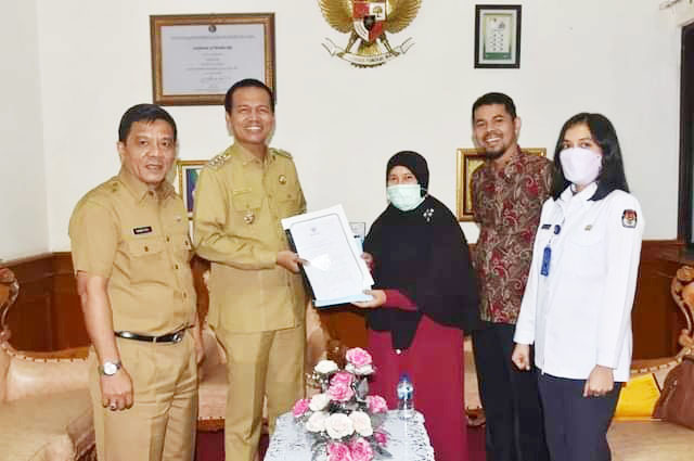 BERKAS TAHAPAN PEMILU— Wako Pariaman Genius Umar terima berkas pengajuan dana untuk pemilu 2024 dari KPU Kota Pariaman.