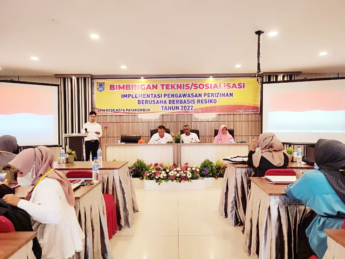 SUDIRMAN, METRO–Pemerintah Kota Payakumbuh melalui Dinas Penanaman Modal dan Pelayanan Terpadu Satu Pintu (DPMPTSP) Kota Payakumbuh menggelar Bimbingan Teknis (Bimtek) Implementasi Pengawasan Berbasis Risiko tahun 2022 angkatan kedua, di Hotel Mangkuto, Rabu (27/7). Kegiatan yang anggarannya bersumber dari dana alokasi khusus (DAK) non fisik 2022 itu diikuti oleh 50 orang perwakilan perusahaan atau pengusaha di Kota Payakumbuh yang telah memiliki izin usaha.