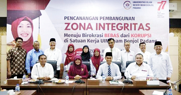LUBUK LINTAH, METRO–Rektor UIN Imam Bonjol, Prof. Dr. Martin Kustati, M.Pd secara resmi mencanangkan pem­bangu­­nan Zona Integritas (ZI) di UIN Imam Bonjol Padang. Pem­bangunan ZI yang menjadikan Fakultas Tarbiyah dan Keguruan (FTK) sebagai pilot project tersebut dilaksanakan di Gedung Rektorat Kampus 2 UIN Imam Bonjol Padang beberapa waktu lalu.