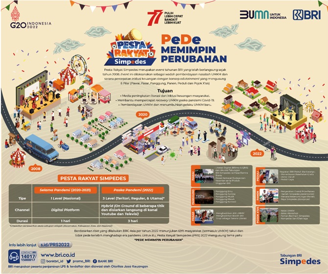 JAKARTA, METRO–Tabungan BRI Simpedes tengah menggelar Pesta Rakyat Simpedes (PRS) 2022. Event ini dilaksanakan sebagai wadah pemberdayaan nasabah usaha mikro kecil dan menengah (UMKM) dan sarana percepatan inklusi keuangan dengan konsep edutainment yang mengusung 6 Pilar (Pawai, Pasar, Panggung, Panen, Peduli, Pokok X’sis)